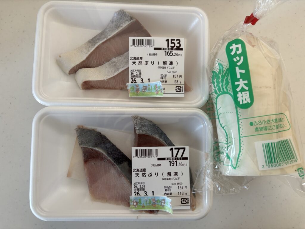 - 食材: 冷凍ブリと、大根をスーパーで購入。