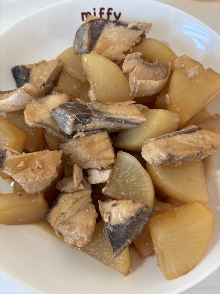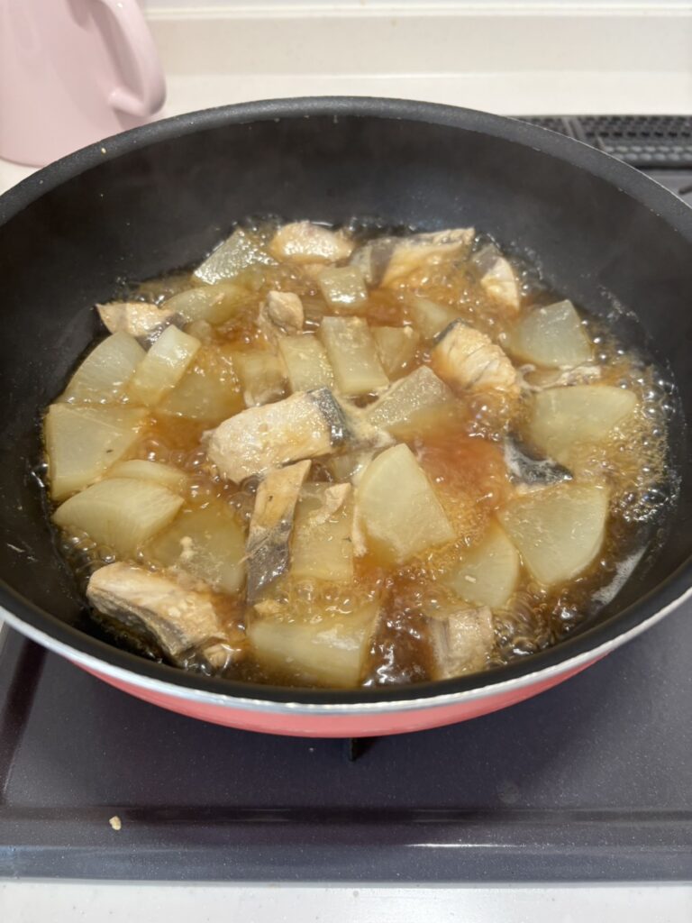 - 完成: フライパンで煮込むこと10分。部屋中にいい香りが。ブリはボロボロでしたがなんとかできました。
