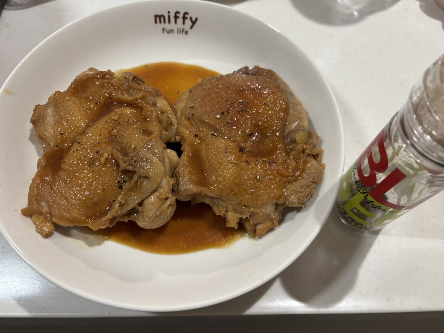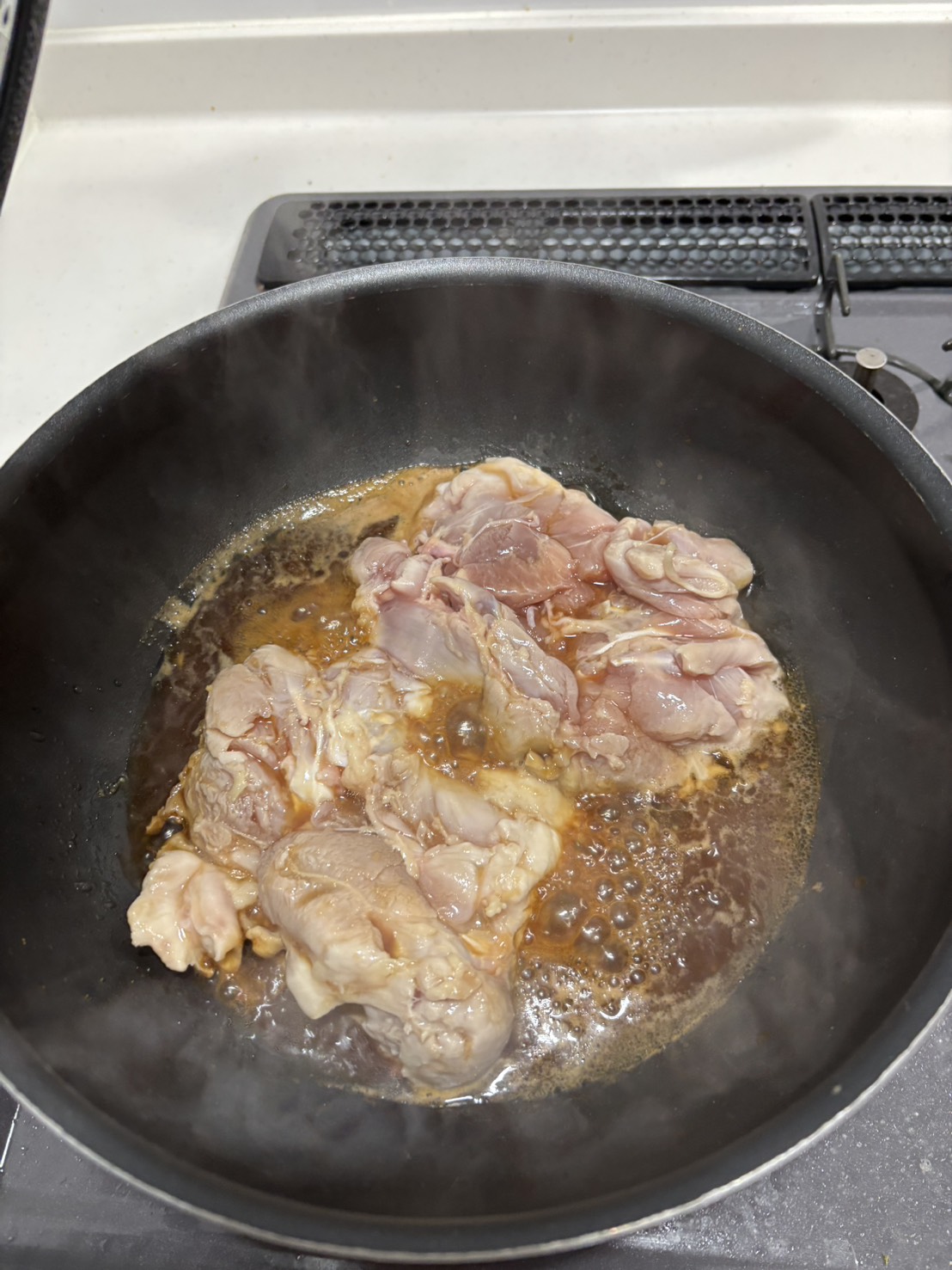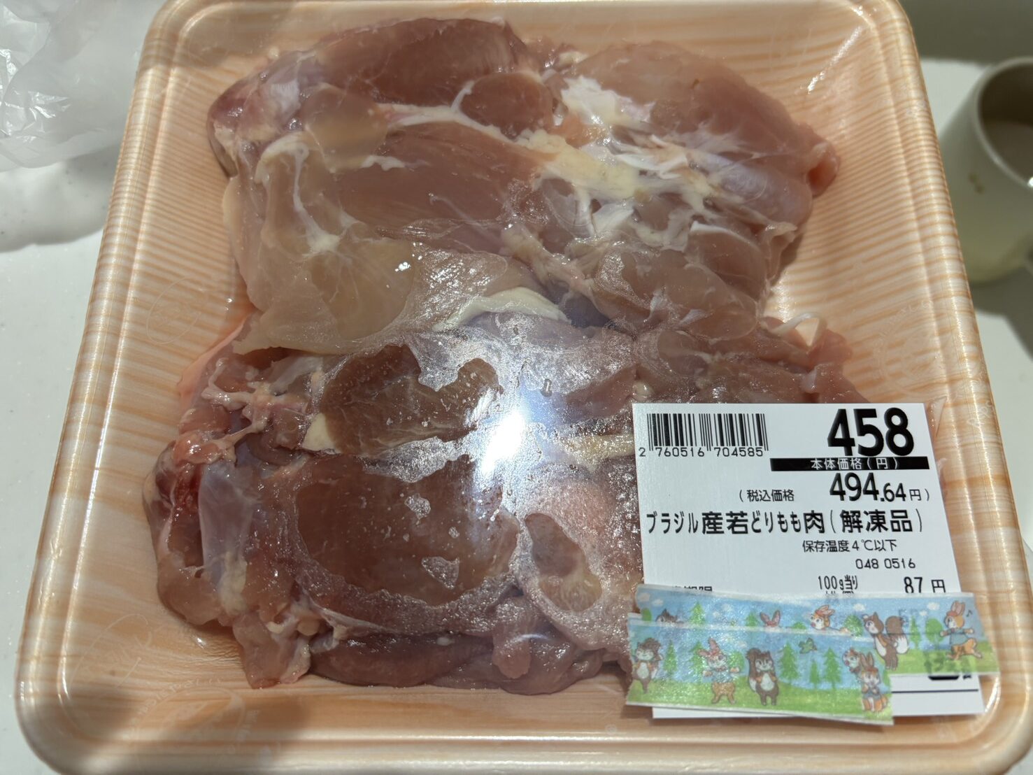 - 食材: スーパーでブラジル産の鶏もも肉2枚を購入。安さは正義です。